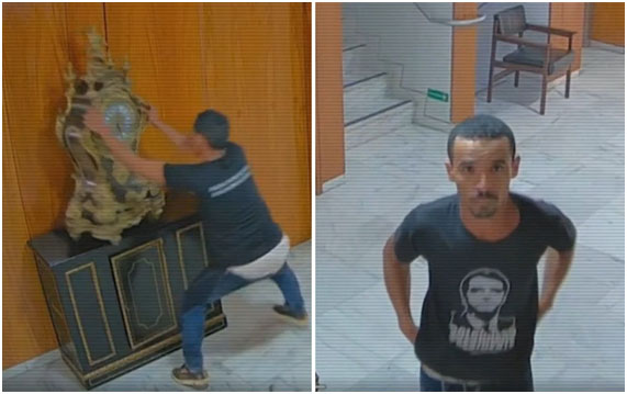 O relógio foi um presente da França ao então rei dom João 6º e estava no 3º andar do Palácio do Planalto. Câmeras de segurança flagraram o momento em que o homem destruiu o objeto. Nas imagens, ele vem caminhando, para, derruba o relógio no chão e revira mesas e cadeiras. Depois, retorna e tenta destruir a câmera de segurança com um extintor de incêndio.