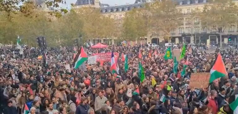 No centro de Paris, os manifestantes portavam cartazes com os dizeres “Pare o ciclo de violência” e “Não fazer nada, não dizer nada é ser cúmplice”. Foi uma das primeiras grandes reuniões de apoio aos palestinos legalmente permitidas na capital parisiense desde o ataque de 7 de outubro. As autoridades francesas haviam proibido concentrações pró-Palestinas em razão da desordem pública.