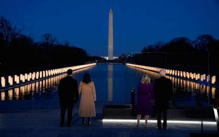 Na véspera de sua posse como presidente dos Estados Unidos, Joe Biden participou de uma homenagem aos mais de 400 mil mortos pela Covid-19 nos país ao desembarcar em Washington DC. Ele teve a companhia da mulher, Jill, de sua vice-presidente, Kamala Harris, e do marido dela, Doug Emhoff.