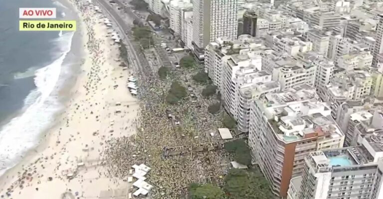 Imagens transmitidas pela TV Globo mostram que o ato pela anistia aos golpistas não conseguiu ocupar quarteirões inteiros nem mobilizar uma multidão, reunindo apenas um grupo diante do palco, com presença espalhada pela avenida e chegando até a faixa de areia. Previsto para começar às 10h, o evento seguiu com baixa adesão mesmo horas depois.