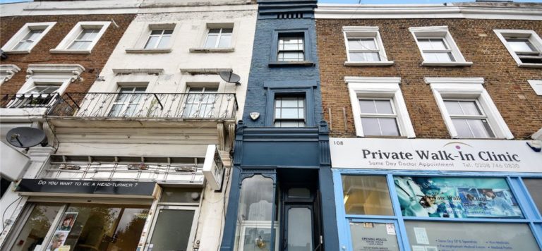 Localizada entre um salão de beleza e um consultório médico, a casa mais estreita de Londres, com apenas 1,7 metros de largura, está à venda por US$ 1,3 milhão (quase R$ 7 milhões, na cotação atual).