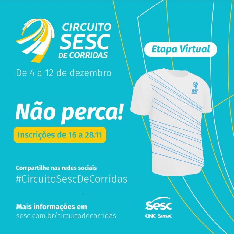 O Circuito Sesc de Corridas e o Mesa Brasil Sesc estão juntos novamente para uma ação de solidariedade. Entre os dias 4 e 12 de dezembro será realizada uma nova etapa virtual do circuito, com valor dos ingressos revertido para a compra de cestas básicas, que serão destinadas a famílias em situação de vulnerabilidade. As inscrições começam dia 16 de novembro e podem ser feitas pelo site www.sesc.com.br/circuitodecorridas.