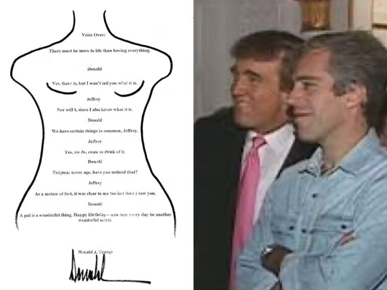 O documento exibido pelos democratas traz uma mensagem datilografada dentro da silhueta de uma mulher nua desenhada à mão. A assinatura “Donald” aparece abaixo da cintura da figura. O texto termina com a frase: “Feliz aniversário — e que cada dia seja mais um maravilhoso segredo.”