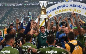 Jair Bolsonaro assiste a jogo do Palmeiras e entrega a taça de campeão