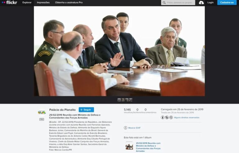 O perfil na rede social X, ex-Twitter, Desmentindo Bolsonaro, publicou uma imagem que consta no perfil oficial do Palácio do Planalto no site de imagens Flicker. Nela, Bolsonaro está no evento intitulado “Reunião com Ministro da Defesa e Comandantes das Forças Armadas”, no dia 25 de fevereiro de 2019. O blog confirmou a informação, que consta neste link.