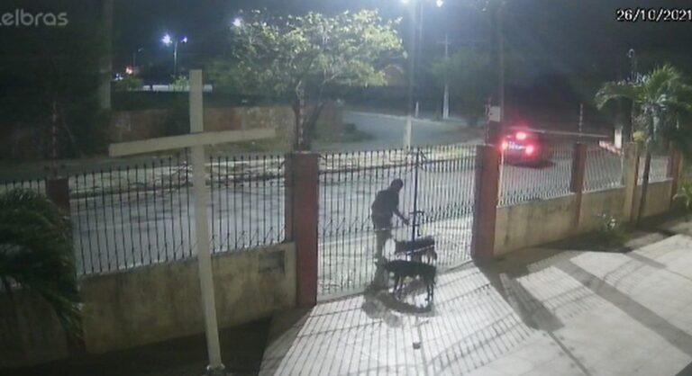Em uma publicação nas redes sociais, a Paróquia Menino Jesus fez um apelo para que a população ajude a encontrar o cão que atende pelo nome de Hércules. As imagens mostram o suspeito sentado na calçada forçando o portão da igreja matriz até conseguir abrir um espaço suficiente por onde o animal passa. Outro cão que estava na área interna do local foi deixado no local.