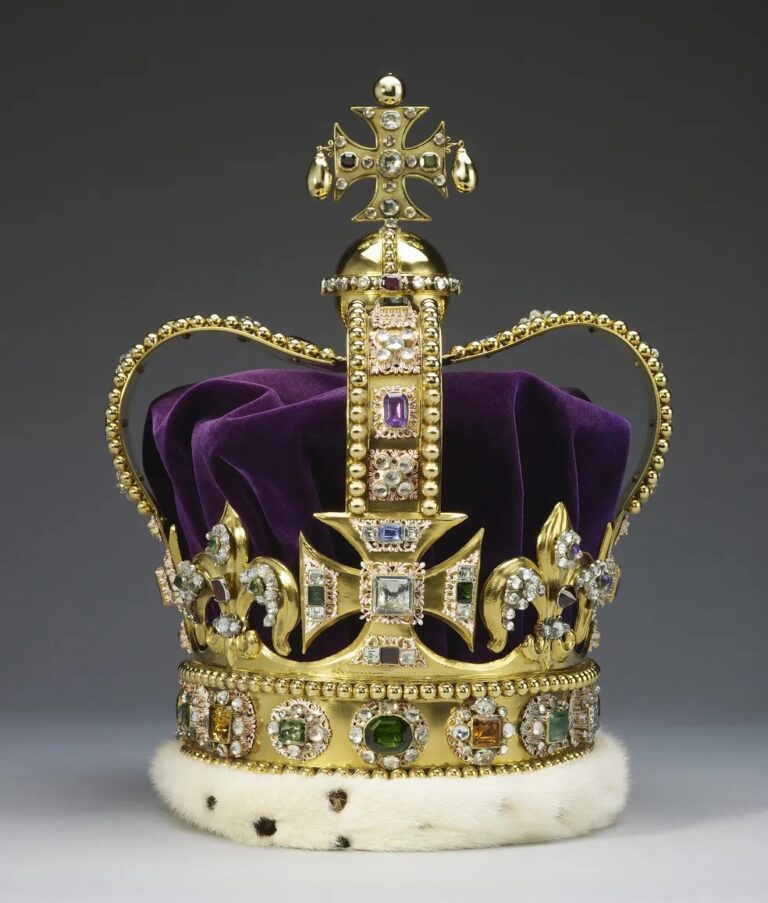 A coroa tem um solidéu de veludo roxo com uma faixa de arminho e mede pouco mais de 30 centímetros de altura. Foi usada pela última vez pela rainha Elizabeth II, em sua coroação em 1953.