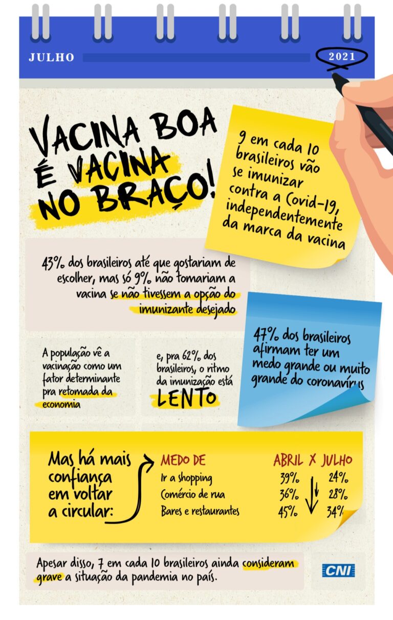 O economista-chefe da CNI, Renato da Fonseca, explica que essas mudanças ocorreram no ato contínuo a percepção sobre o processo de vacinação. Para 68% da população, o ritmo de vacinação aumentou ou aumentou muito em julho, em relação a junho.