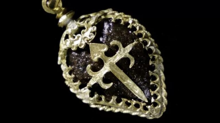 Um segundo pingente de ouro encontrado em meio aos destroços é oval e tem 4,7 centímetros de comprimento.