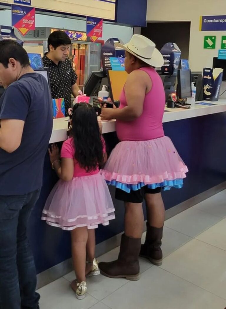 Pai se veste de tutu e collant para assistir Barbie junto com a filha no México