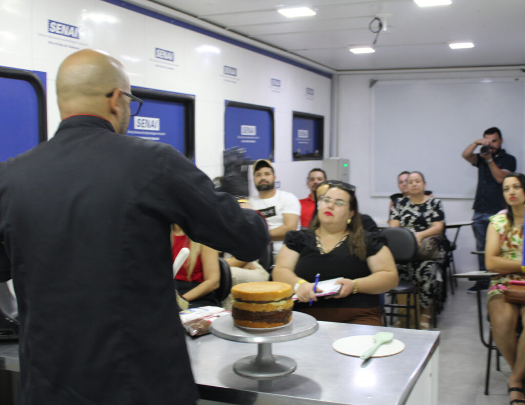 Na unidade móvel do SENAI Paraíba, empreendedores do segmento de confeitaria acompanharam oficinas oferecidas por parceiros da instituição: Bettercreme, o chantilly mais estável do mercado – Richs, Decoração de tortas – Master Martini e Dom Padeiro, e Tortas: brilhos, recheios e ganaches – Adinor.