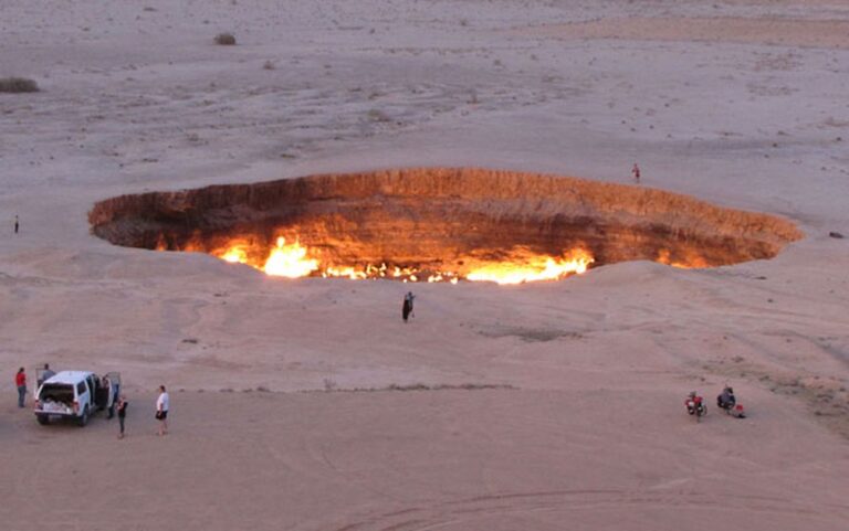 Temendo que a cratera emitisse gases venenosos, os cientistas tomaram a decisão de colocar fogo, pensando que o gás iria queimar rapidamente. Mas as chamas não acabaram em mais de 50 anos, em um símbolo poderoso das vastas reservas de gás do Turcomenistão. Enquanto isso, visitantes viajam até lá para conferir o fenômeno de perto.