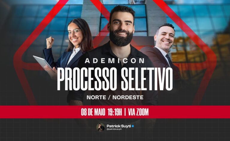Neste dia 8 de maio, às 19h19, o diretor regional da Ademicon para o Norte e Nordeste, Patrick Suyti, promove uma seletiva online e gratuita voltada para a contratação de consultores e gestores comerciais que desejam integrar a estrutura da maior administradora de consórcios independente do país em créditos ativos.