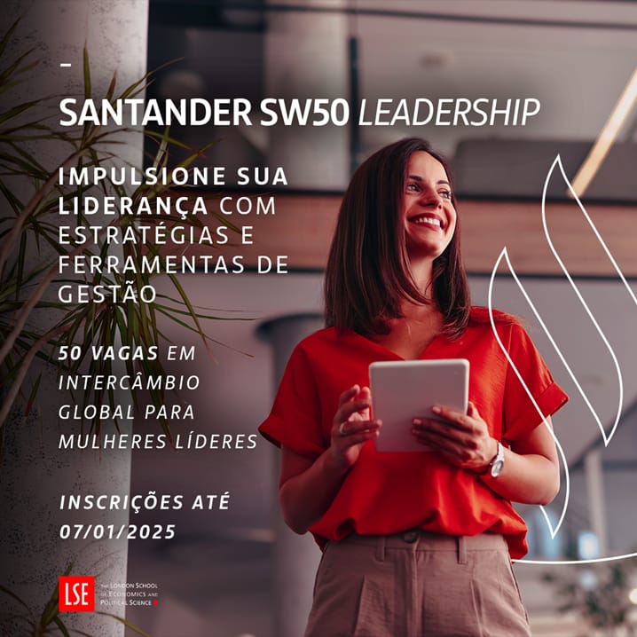 O Banco Santander lança uma nova edição do Santander W50 (SW50), programa de liderança feminina que busca identificar e fortalecer o talento das melhores executivas do mundo. A iniciativa é voltada a mulheres em posições de liderança que desejam refletir sobre seu papel, desenvolver suas habilidades de gestão e ampliar seu impacto nas organizações e na sociedade. São elegíveis mulheres de todas as idades que tenham inglês avançado e ocupem posições de alta gestão, cargos de C-level ou que fazem parte de conselhos de administração. As interessadas podem se inscrever até 7 de janeiro, CLICANDO AQUI.