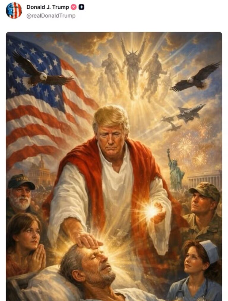 Alguns minutos depois, Trump publicou uma imagem gerada por inteligência artificial em que retrata ele com uma túnica branca abençoando um homem doente. A imagem ainda mostra a bandeira dos Estados Unidos, a Estátua da Liberdade, caças de guerra, uma aeronave espacial e gaviões.