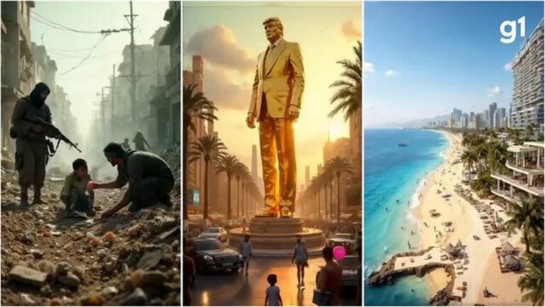 Com a legenda “Gaza 2025”, o vídeo também mostra o premiê israelense, Benjamin Netanyahu, tomando um drinque em uma piscina e Elon Musk distribuindo dólares para crianças em uma praia.